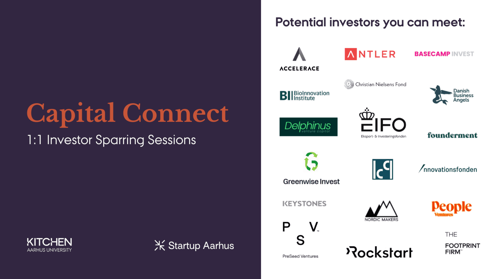 At the event, you can potentially meet Accelerace, Antler, Basecamp Invest, BioInnovation Institute, Christian Nielsens Fond, Danish Business Angels, Delphinus Venture Capital, EIFO Eksport- & Investeringsfonden, EP Capital, Founderment, Fusion Capital, Greenwise Invest, ICP, Innovationsfonden, Keystones, Nordic Makers, People Ventures, PreSeed Ventures, Rockstart, The Footprint Firm, Noon Ventures, Startup Aarhus and Kitchen, Aarhus University.